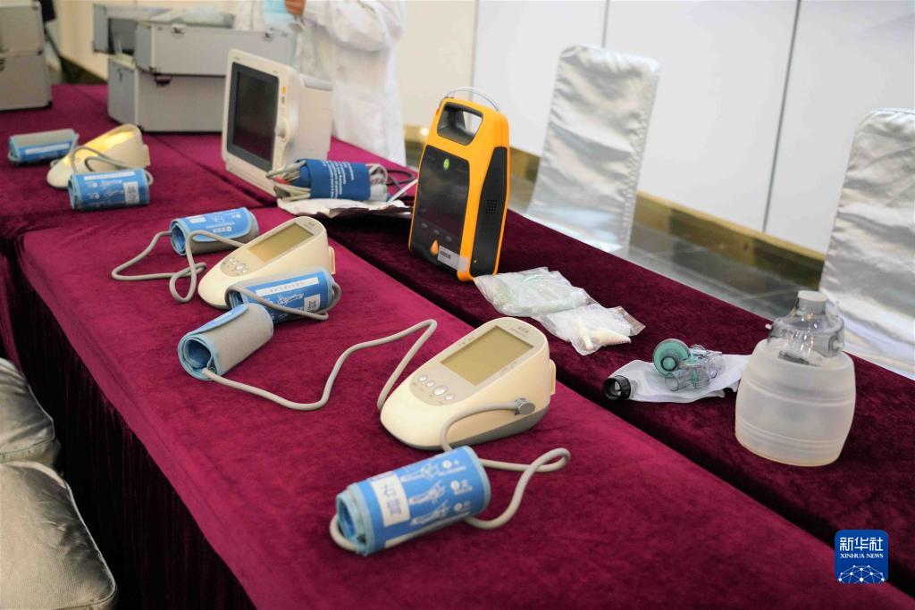 5月26日,北京高原適應研究康復中心的醫(yī)護人員在介紹隨車醫(yī)藥箱。新華社發(fā)(王靜頤攝)