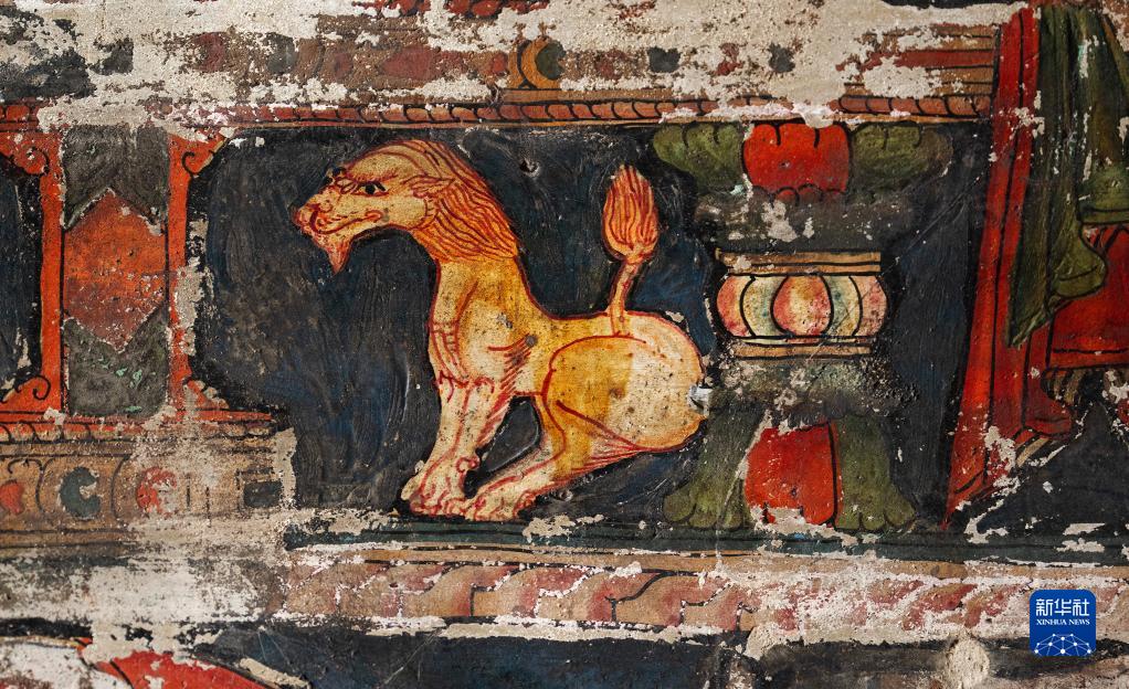這是5月26日拍攝的皮央石窟壁畫中的獅子像。新華社記者 費(fèi)茂華 攝