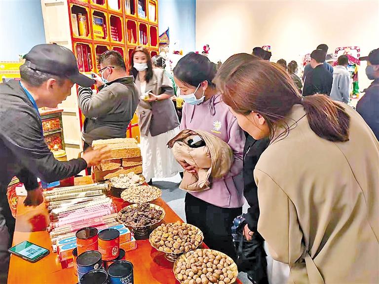 步入2號(hào)館西藏特色展區(qū)之山南市形象館,身著山南服飾的講解員、充滿山南特色的各類農(nóng)產(chǎn)品,來(lái)往的人絡(luò)繹不絕,或駐足品嘗黑青稞糌粑、或與參展商留下聯(lián)絡(luò)方式?!拔覀儊?lái)自山南市洛扎縣,今天帶了卡墊、奶渣、辣椒等13種產(chǎn)品,通過(guò)藏博會(huì)這么好的平臺(tái),把家鄉(xiāng)的特色產(chǎn)品推銷出去、宣傳出去,我感到非常欣喜。”來(lái)自山南市的參展商索南旦增說(shuō)。