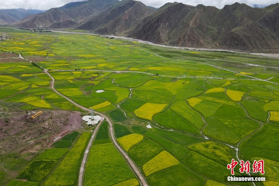 7月24日,航拍西藏堆龍曲沿岸的油菜花田與青稞地。堆龍曲是拉薩河支流,源頭位于念青唐古拉山脈西南,流經(jīng)羊八井、德慶鎮(zhèn),至堆龍德慶區(qū)注入拉薩河干流。近日,西藏堆龍曲兩岸油菜花盛放,呈現(xiàn)出一幅“高原不與四時(shí)同、七月才開二月花”的美麗景象。駕車經(jīng)過或漫步其間,高原油菜花散發(fā)出陣陣花香,像是“春天的味道”。江飛波 攝