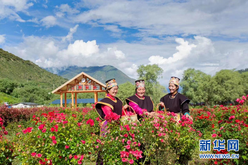 圖為當?shù)卮迕裨诠げ蓟ü让倒宸N植園內(nèi)采摘玫瑰花朵。 (工布花谷 李磊 供圖)