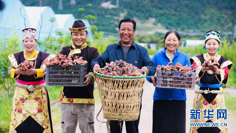 圖為紅太陽科技示范家庭農(nóng)場創(chuàng)始人尼瑪帶著村民慶祝靈芝豐收。(紅太陽科技示范家庭農(nóng)場供圖)