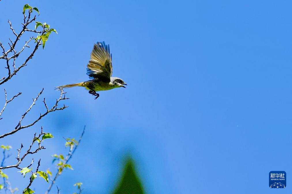 在拉薩市城關(guān)區(qū)一處庭院,一只伯勞飛離枝頭(7月28日攝)。新華社記者 張汝鋒 攝