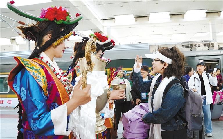 游客們走下列車,被眼前的一切深深吸引。他們有的拿出手機(jī),記錄下這難忘的瞬間,有的則沉浸在這歡樂(lè)的氛圍中,感受著京藏兩地的深厚情誼。