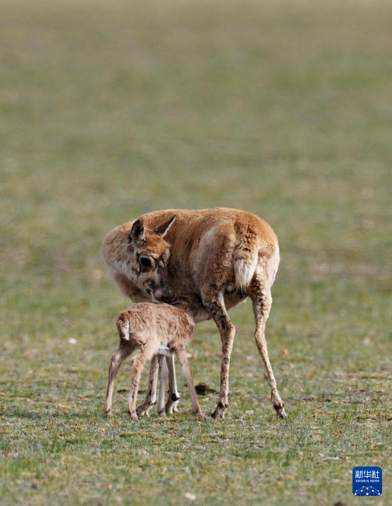 魯確塘草原上,小藏羚羊在吃奶(6月17日攝)。新華社記者 普布次仁 攝