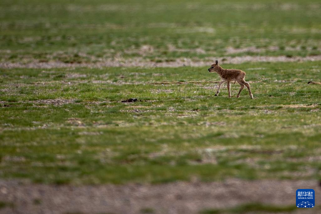 6月17日,在魯確塘草原,一只剛出生不久的小藏羚羊跟著母藏羚羊在草原上漫步。新華社記者 費茂華 攝
