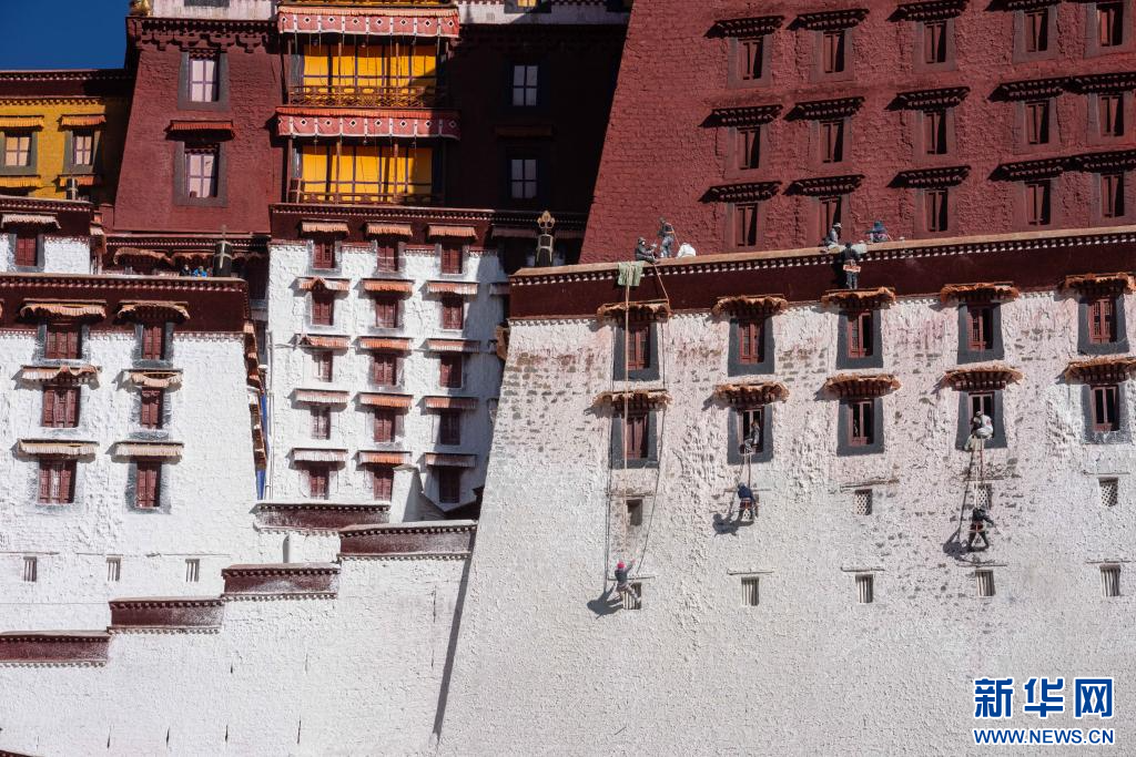 10月30日,布達(dá)拉宮管理處工作人員開展例行“潑甜墻”,對外墻進(jìn)行粉刷。新華社記者旦增尼瑪曲珠 攝