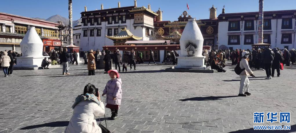11月29日,游客在西藏拉薩大昭寺前留念,其身后的煨桑爐設(shè)有煙筒和鋼制攔火門。新華社記者魏冠宇 攝