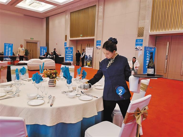 圖為餐廳服務(wù)比賽現(xiàn)場,選手正在以規(guī)范動作進行擺盤(杯)、桌花、倒酒等環(huán)節(jié)比賽。記者 孫開遠 攝