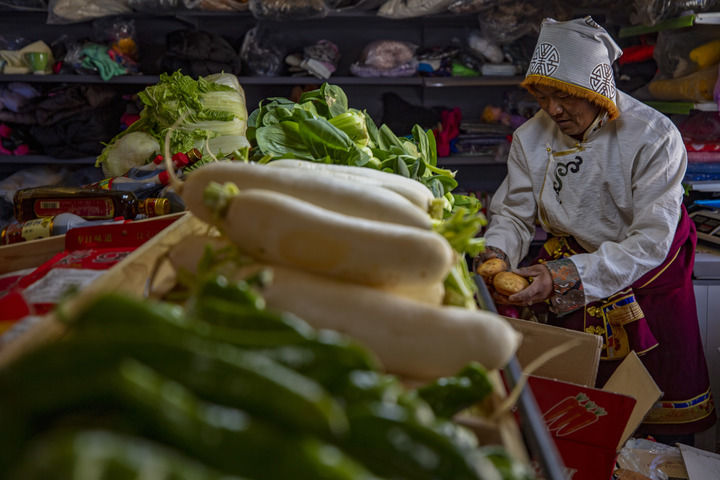 在西藏那曲市申扎縣馬躍鄉(xiāng)貝嘎四村偏遠(yuǎn)鄉(xiāng)鎮(zhèn)果蔬配送試點項目直銷點,店主西熱加措在整理供銷合作社配送來的新鮮蔬菜(2024年1月5日攝)。新華社記者 姜帆 攝