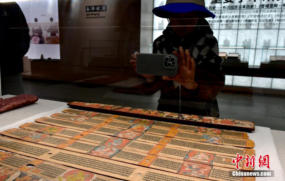 以“見證與守望——鑄牢中華民族共同體意識主題展”為主題的展覽近日亮相西藏自治區(qū)拉薩市布達拉宮雪城珍寶館。本次主題展精選100余件文物珍品,展覽通過文物、古籍及布達拉宮的傳承與發(fā)展,講述各民族交往交流交融的故事。圖為1月2日,觀眾拍攝展覽中的13世紀《般若八千頌》貝葉經寫本。中新社記者 李林 攝