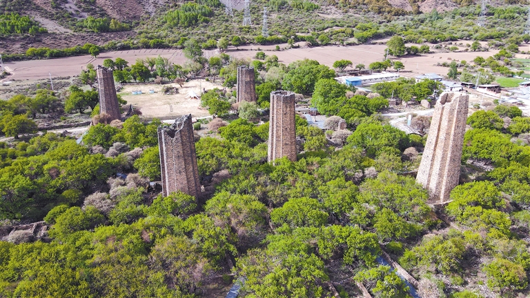 這些堡壘通體呈土黃色、棕褐色,主要由片石、木頭壘砌而成,內(nèi)部嵌有木梁,既起到了支撐作用,又能供人攀爬至堡頂。堡壘墻厚2米,從基部到頂部逐步縮小,中間空洞,沒有頂蓋,周身有對稱的孔洞,內(nèi)部呈八角狀,外觀則棱角分明,呈現(xiàn)出十二面十二棱的棱柱狀,造型設計巧妙牢固且氣勢恢宏,彰顯了千年以前青藏高原上高超的建筑技藝。