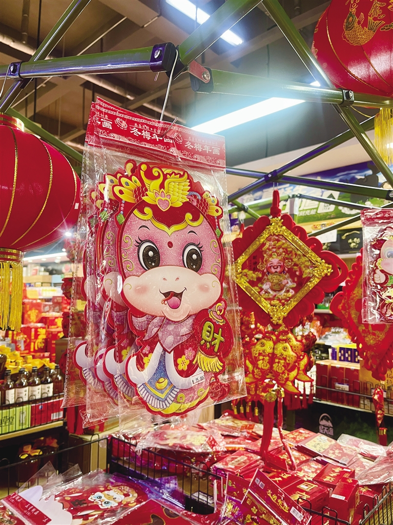在永輝、百益等商超里,新年的氛圍同樣濃厚。超市入口處最顯眼的位置掛出了紅艷艷的對(duì)聯(lián)、燈籠、錦鯉小掛飾、金蛇送福貼紙等新春飾品,供顧客們選購(gòu)。這些春聯(lián)和掛飾價(jià)格在十幾元至幾十元不等,款式豐富,寓意美好,深受人們喜愛。