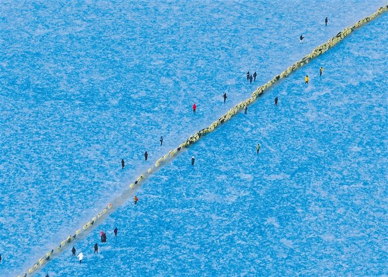 清晨,當(dāng)?shù)谝豢|陽(yáng)光灑在冰面上,牧民便開(kāi)始了他們的旅程。穿著傳統(tǒng)服飾的老爺爺帶頭驅(qū)趕著羊群踏上冰面。羊群沿著爐灰鋪成的小路緩緩前行,宛如一條長(zhǎng)長(zhǎng)的金色線(xiàn)條,在藍(lán)冰上勾勒出一幅亮麗畫(huà)卷。途中,偶爾會(huì)有小羊因冰面濕滑而摔倒,牧民總是及時(shí)將它們扶起,或背或抱地送到島上。