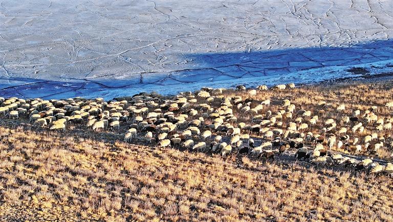朝陽(yáng)下,羊群在牧民和民警的保護(hù)下前往湖心島牧場(chǎng)。