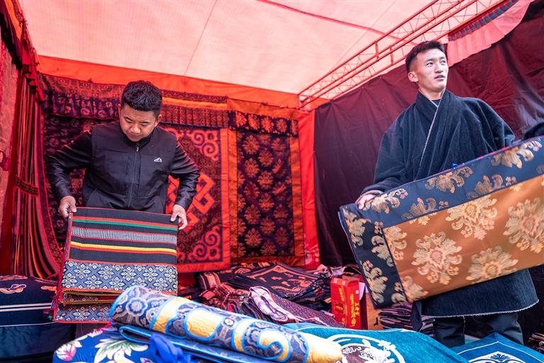 據(jù)悉,此次堆龍德慶區(qū)的年貨節(jié)以“逛展位、享樂購(gòu)、觀演藝、送政策、寫祝福”為五大核心亮點(diǎn)。參展商戶共有118戶,其中既有堆龍本土企業(yè)和合作社帶來(lái)的藏歷新年年貨、農(nóng)畜加工產(chǎn)品、民族手工藝品、傳統(tǒng)服飾,也有山南錯(cuò)那市相關(guān)企業(yè)帶來(lái)的特色產(chǎn)品,品類總數(shù)達(dá)百余種。開幕當(dāng)日人流量達(dá)1000余人,銷售額10萬(wàn)余元,呈現(xiàn)出購(gòu)銷兩旺的熱鬧景象。攤主土旦羅布介紹:“這次我?guī)?lái)了藏歷新年禮盒套裝,里面不僅包含了藏文對(duì)聯(lián)和吉祥八寶紅包,還有‘古突’里可包裹的12種代表不同寓意的簽文及寓意,很有過(guò)年的儀式感,非常受市民歡迎。”
