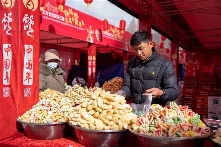 活動(dòng)當(dāng)天,記者來(lái)到位于拉薩市城關(guān)區(qū)蔡公堂街道恩惠苑社區(qū)翰林苑小區(qū)附近的年貨市場(chǎng),只見現(xiàn)場(chǎng)人聲鼎沸。150個(gè)攤位整齊排列,各類年貨商品琳瑯滿目,讓人目不暇接。這里有糖果、堅(jiān)果、酥油、卡塞等傳統(tǒng)食品,有豬肉、牛肉干、羊肉等肉類制品,還有臘味熟食、奶渣餅等特色小吃,以及藏文對(duì)聯(lián)、喜慶裝飾、廚具餐具等日用百貨,完全能滿足居民群眾一站式的年貨購(gòu)物需求。
