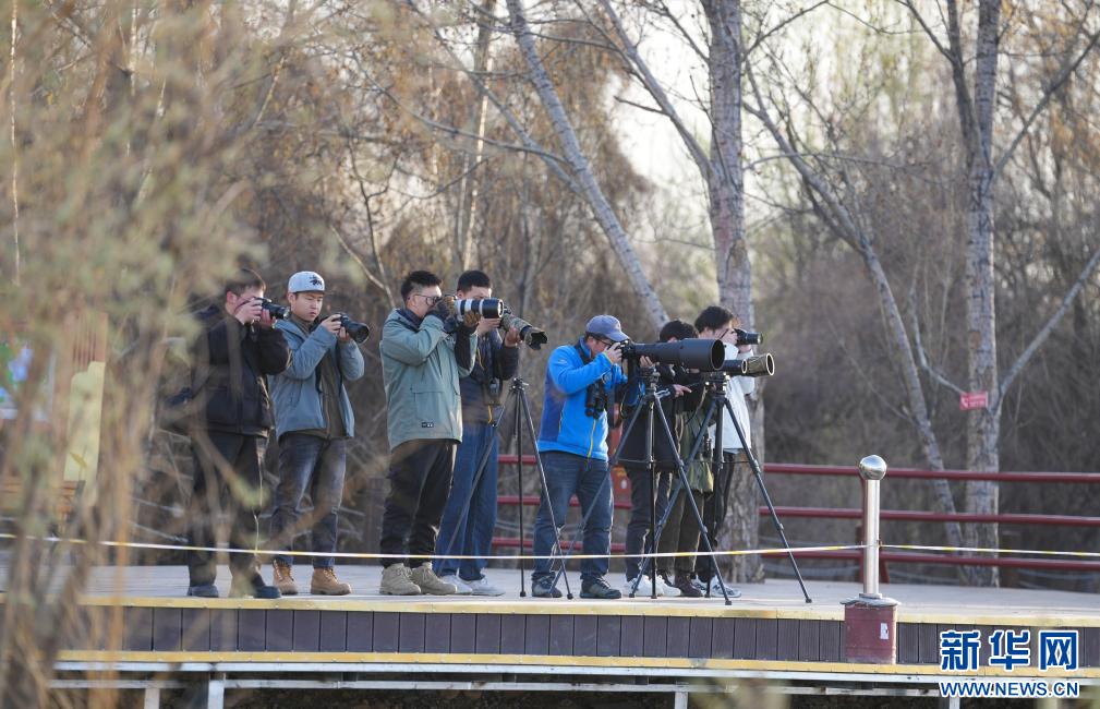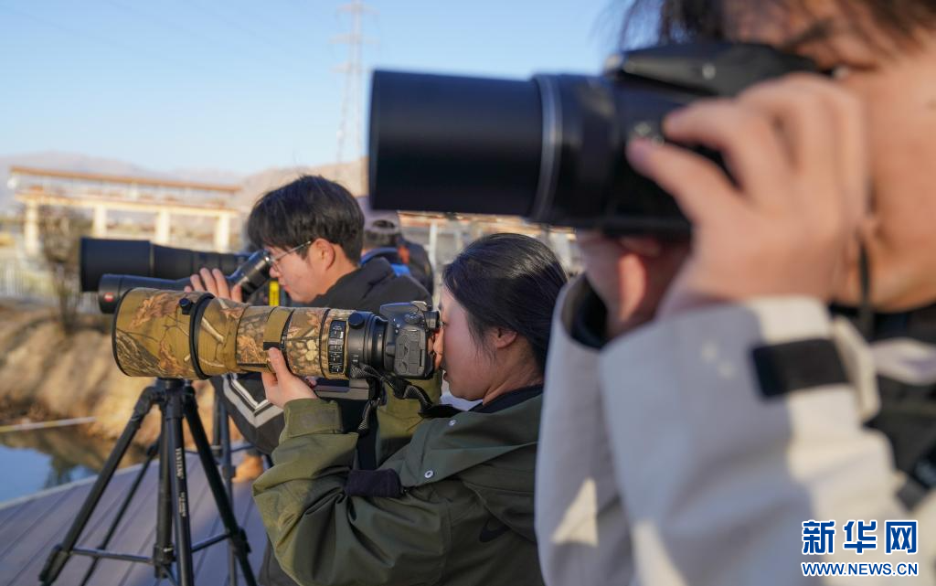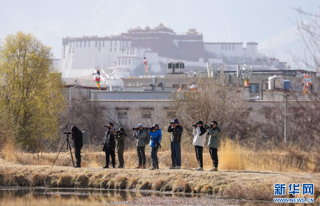 3月29日,參加采風(fēng)活動(dòng)的成員在拉魯濕地觀鳥(niǎo)拍照。(新華社記者 晉美多吉 攝)