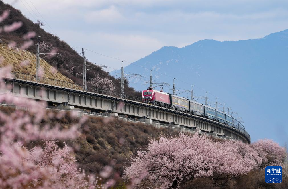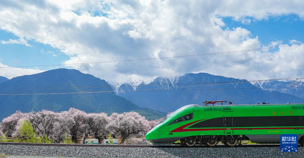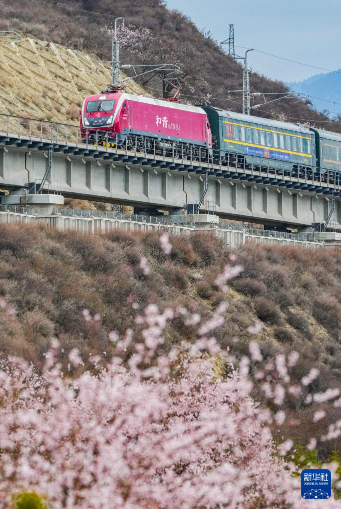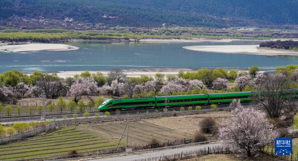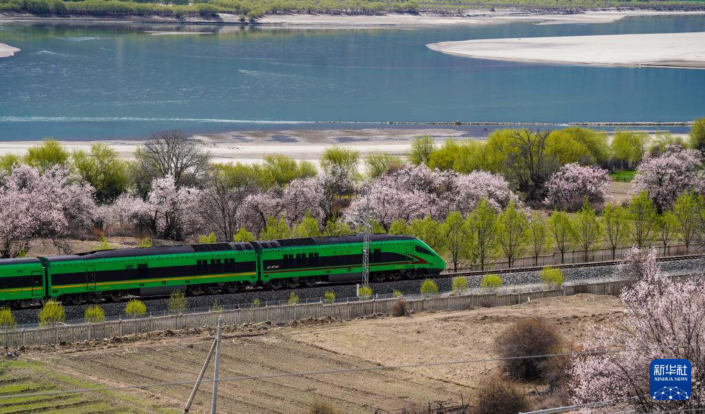 四月,藏東南河谷桃花初綻,車窗外雪山與桃林交相輝映,拉林鐵路列車穿行在桃花掩映的尼洋河畔,繪就高原獨(dú)有的春之畫卷。
