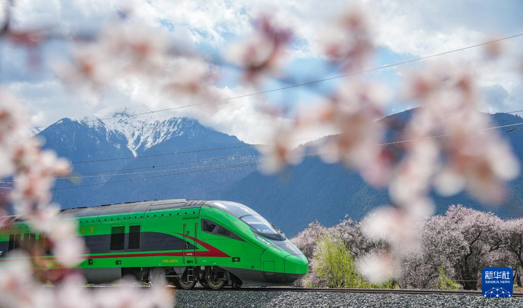 當(dāng)列車駛?cè)肓种ゾ硟?nèi),桃花的盛景會達(dá)到高潮,野生桃花漫山遍野。車在花中跑,人在畫中游,馳騁的復(fù)興號動車與鐵道旁盛開的桃花構(gòu)成了一幅人與自然和諧共生的畫卷?!暗谝淮慰吹綇?fù)興號從眼前飛馳而過,就像看見家鄉(xiāng)的雄鷹掠過雪山?!绷种フ景矙z員德吉拉姆說。
