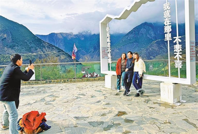 游客在雅魯藏布江大拐彎觀(guān)景臺(tái)拍照留念。記者 白瑪澤旺 攝