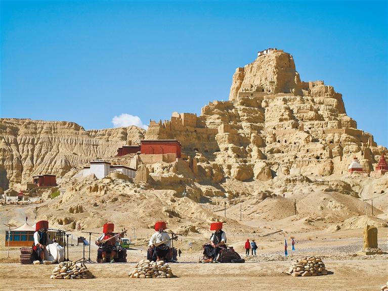 圖為5月19日,朵熱樂隊在札達(dá)縣古格王國遺址前彈奏民俗樂曲。記者 洛桑旦增 攝