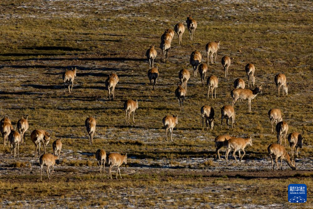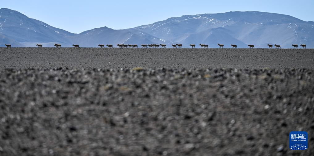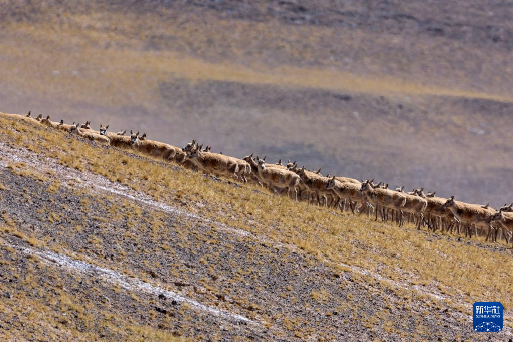 在羌塘國(guó)家級(jí)自然保護(hù)區(qū)核心區(qū)拍攝的遷徙中的雌藏羚羊群(6月9日攝)。新華社記者 旦增尼瑪曲珠 攝 ??