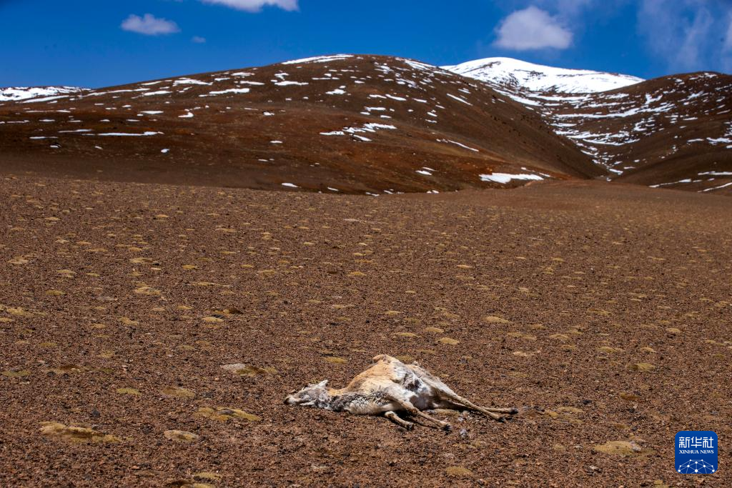 一頭雌性藏羚羊在羌塘國(guó)家級(jí)自然保護(hù)區(qū)核心區(qū)繁殖遷徙的路上死于狼口(6月8日攝)。新華社記者 姜帆 攝 ??