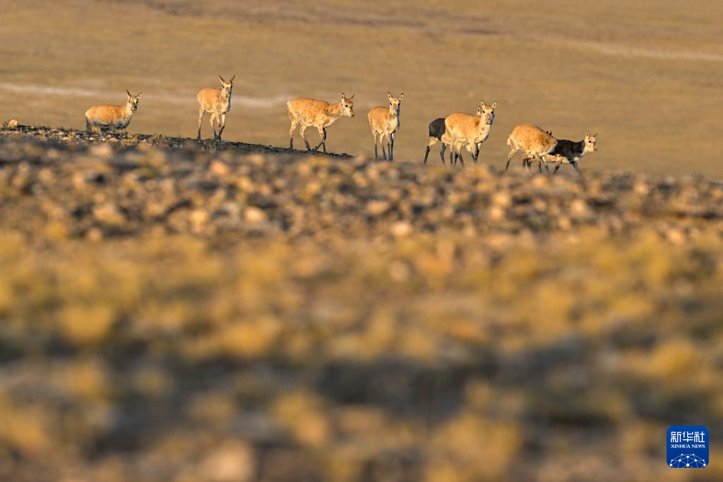 在羌塘國(guó)家級(jí)自然保護(hù)區(qū)核心區(qū)拍攝到的雄性和亞成體雌性藏羚羊(6月9日攝)。新華社記者 旦增尼瑪曲珠 攝 ??