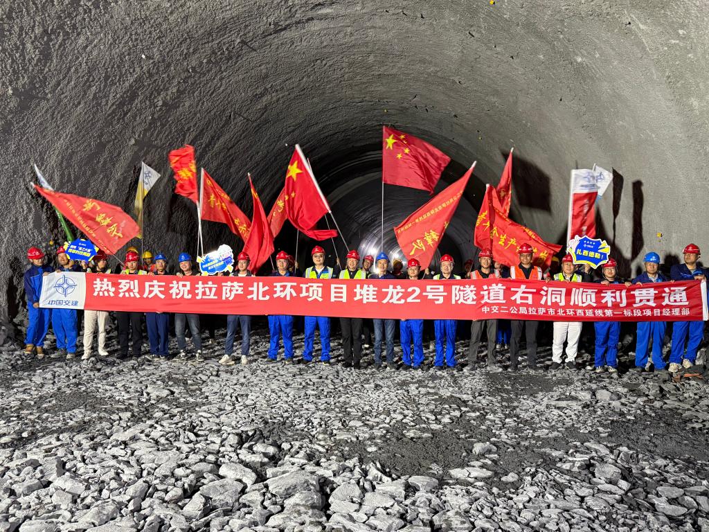 中交二公局工作人員在堆龍2號(hào)隧道貫通現(xiàn)場(chǎng)慶祝留影。(中交二公局供圖)