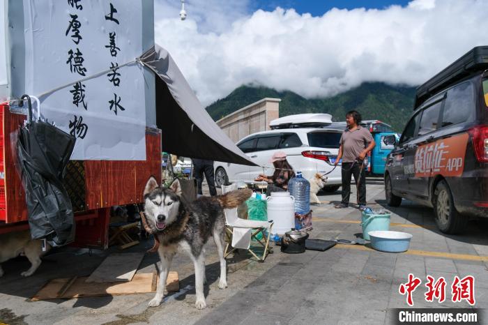 6月29日,西藏林芝宇拓公園自駕露營(yíng)地的哈士奇,它跟隨主人乘電動(dòng)三輪車(chē)進(jìn)藏。中新社記者 江飛波 攝