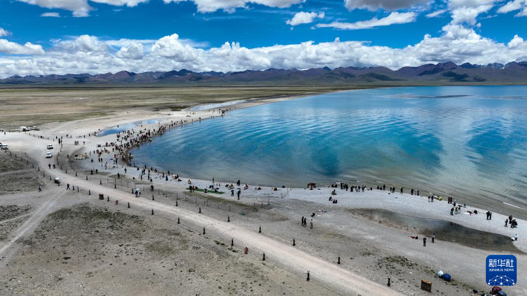 7月16日,在西藏拉薩市當(dāng)雄縣納木錯(cuò)扎西島景區(qū),來(lái)自世界各地的游客享受著夏日納木錯(cuò)清爽的風(fēng)。納木錯(cuò)湖面海拔4718米,是世界上面積超過(guò)1000平方公里的湖泊中海拔最高的湖泊。2024年,納木錯(cuò)扎西島景區(qū)接待游客約40萬(wàn)人次?! ??