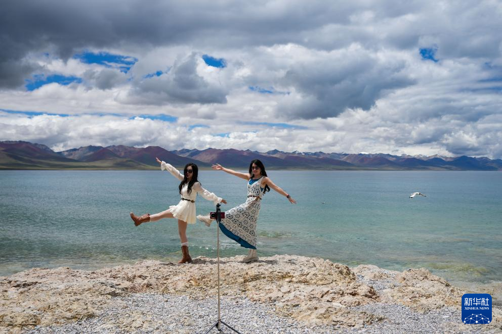 7月16日,兩名游客在納木錯(cuò)湖邊自拍。新華社記者 晉美多吉 攝 ??