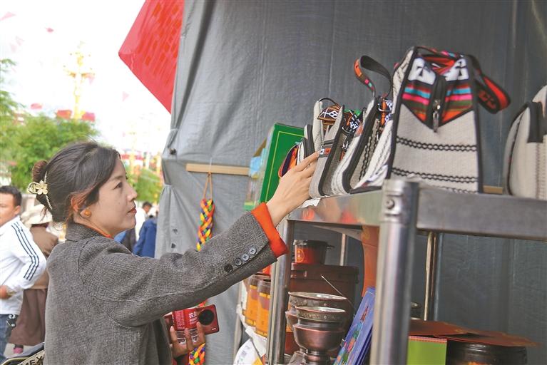 圖為曲松縣農(nóng)產(chǎn)品展銷活動中,具有當(dāng)?shù)靥厣氖止ぞ幙棶a(chǎn)品深受青睞。記者 丹增平措 攝