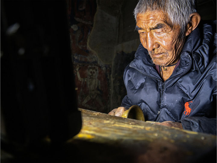 很多年里,只有阿旺老人在守護(hù)著偏遠(yuǎn)的石窟——就連當(dāng)?shù)厝艘膊焕斫獍⑼谧鲂┦裁?。“那?huì)兒大家都覺得這些畫沒什么特別的?!卑⑼f,“但我覺得只要保護(hù)好,以后會(huì)有人明白的?!?/p>