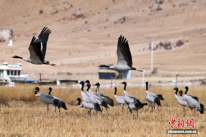 黑頸鶴是中國(guó)國(guó)家一級(jí)保護(hù)動(dòng)物,是唯一生活、繁殖在高原的鶴類,被藏族民眾譽(yù)為“吉祥鳥”。近日,西藏自治區(qū)拉薩市林周縣林業(yè)和草原局介紹,作為黑頸鶴重要的越冬棲息地,今年該縣境內(nèi)黑頸鶴數(shù)量在1800只至2300只之間,其中虎頭山水庫(kù)卡東村一帶占比約一半。中新網(wǎng)記者在周邊看到,不少黑頸鶴在田間覓食,不時(shí)飛翔于高原農(nóng)田、村落上空,舞動(dòng)的鶴影和聲聲鶴鳴為冬春時(shí)節(jié)的高原增添了幾分靈動(dòng)。圖為2月8日,黑頸鶴群在悠閑覓食。江飛波 攝