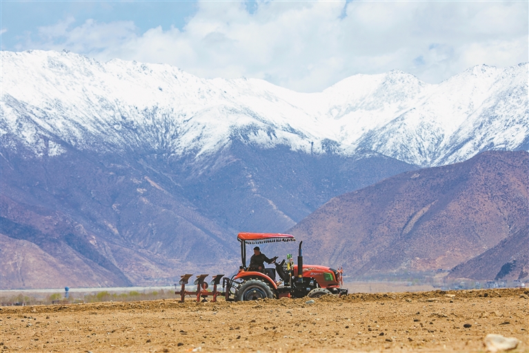 在拉薩市墨竹工卡縣唐加鄉(xiāng)拉東村,大型農(nóng)機(jī)來回穿梭在田野間翻耕新土。記者 王敏 通訊員 洛克 攝