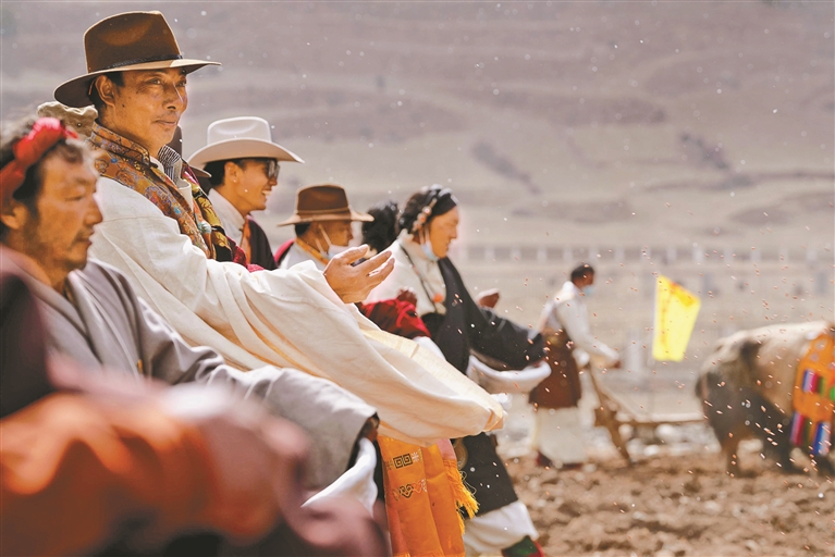在那曲市索縣首屆高原春耕春播啟動(dòng)儀式上,身著盛裝的農(nóng)牧民群眾共同播撒希望的種子。記者 汪純 通訊員 索朗白姆 攝