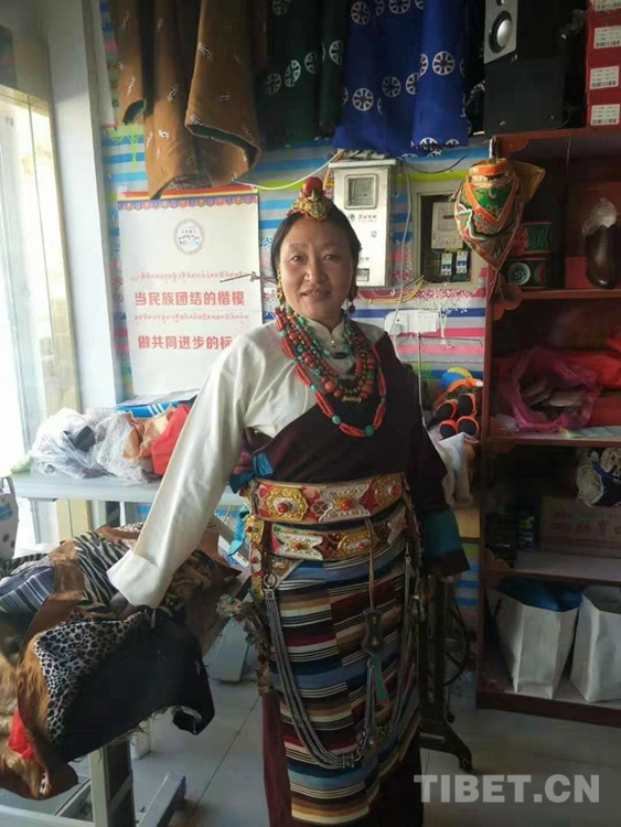 圖為扎西次措在藏式服裝店里展示自家生產(chǎn)的服飾 圖片由扎西次措提供
