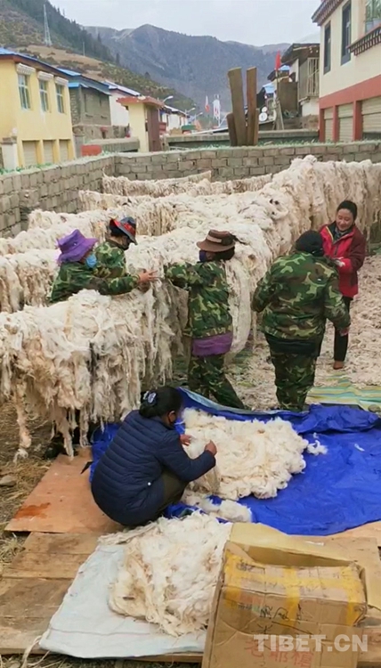 圖為扎西次措(右一)與學徒工人們晾曬羊毛 圖片由扎西次措提供