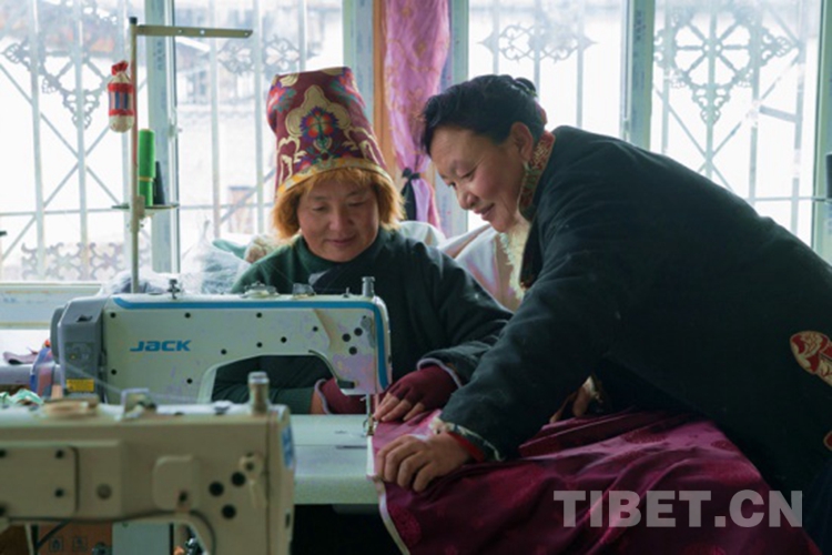 圖為扎西次措(右)指導(dǎo)次央巴措加工藏裝 攝影:鄭朔