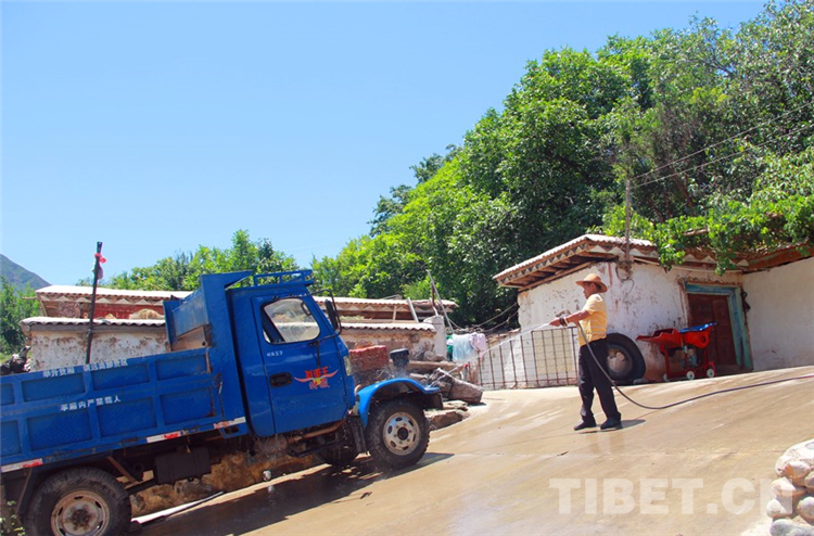 圖為丁增拉姆的父親在沖洗家里的農(nóng)用汽車 攝影:王茜