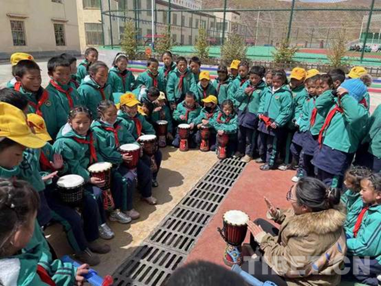 圖為西藏自治區(qū)那曲市比如縣達(dá)塘鄉(xiāng)的孩子們學(xué)打鼓 攝影:嘎瑪卓瑪
