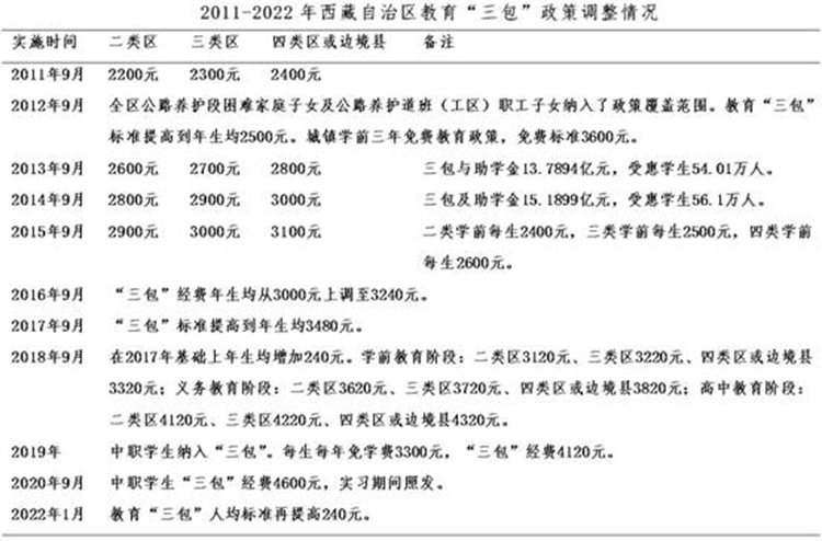黨的十八大以來,“三包(包吃、包住、包學(xué)費(fèi))”人均標(biāo)準(zhǔn)不斷大幅提升。2012年起,西藏全面落實(shí)15年公費(fèi)教育“三包”政策。同年底,西藏“三包”年總經(jīng)費(fèi)由2008年的3.61億元增加到12.29億元,年均增幅達(dá)36%,受惠學(xué)生增加到51萬(wàn)人。 到2014年,西藏“三包”經(jīng)費(fèi)增加到15.19億元,全區(qū)有52.5萬(wàn)名學(xué)生受益,覆蓋面100%,實(shí)現(xiàn)了由“選擇性保障”到“覆蓋式保障”。 中央第六次西藏工作座談會(huì)后,投入力度更大。1985-2015年30年間,西藏“三包”經(jīng)費(fèi)累計(jì)投入逾80億元, 而到2020年35年投入超200億元。僅2016-2020年,西藏教育“三包”資金投入達(dá)104.74億元,年均增幅11.4%。 從1985年到2020年的35年間,西藏教育“三包”政策累計(jì)調(diào)整20次,2011-2020年的10年間,就調(diào)整了10次。2022年1月,“三包”人均標(biāo)準(zhǔn)再次提高。在比如縣,2021年底全縣享受“三包”及助學(xué)金的學(xué)生達(dá)到17771人, 占比如縣總?cè)丝诘?4.5%。