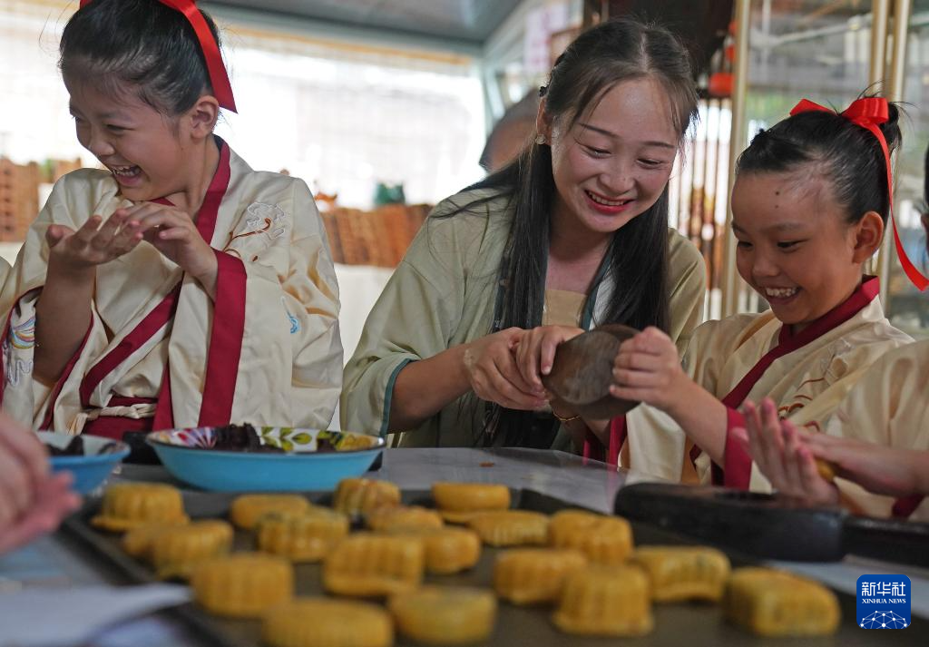 9月11日,孩子們?cè)诨顒?dòng)上體驗(yàn)傳統(tǒng)手工月餅制作。新華社記者 萬(wàn)象 攝