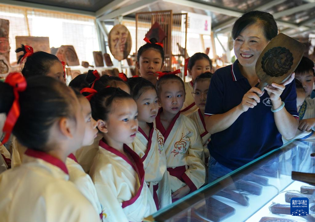 9月11日,孩子們?cè)趨⒂^傳統(tǒng)手工糕餅?zāi)>?。新華社記者 萬(wàn)象 攝