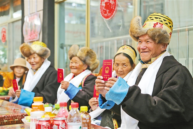 圖為山南市瓊結(jié)縣特困人員集中供養(yǎng)服務中心的“新人”阿南高興地展示自己的結(jié)婚證。記者 白瑪澤旺 通訊員 倫珠澤旺 攝