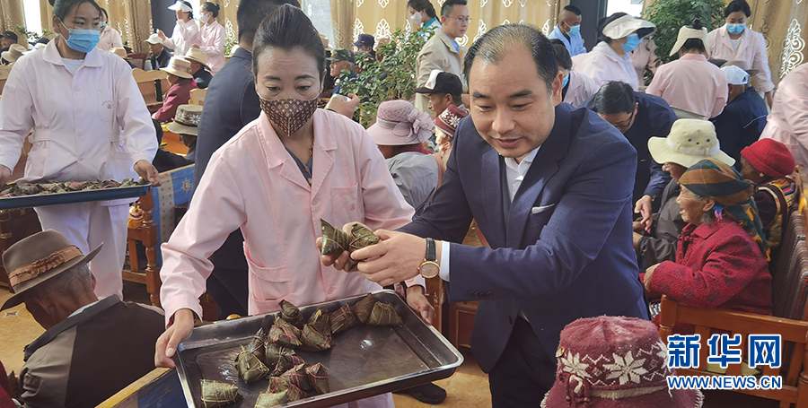 6月3日,在西藏山南市集中供養(yǎng)服務中心,安徽第七批援藏工作隊隊長汪華東為孤寡老人送上粽子。新華網(wǎng) 王雷 攝