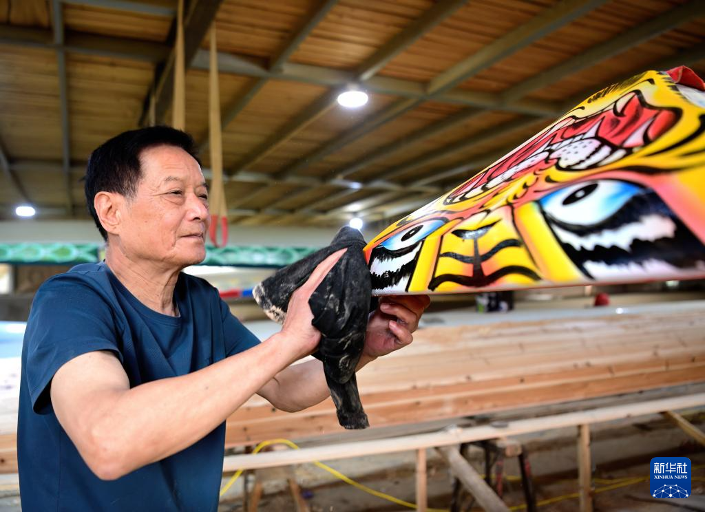 6月3日,福州市非物質(zhì)文化遺產(chǎn)“方莊龍舟制造技藝(閩侯縣)”的傳承人方紹晃在擦拭準(zhǔn)備交付的龍舟船頭。新華社記者魏培全攝