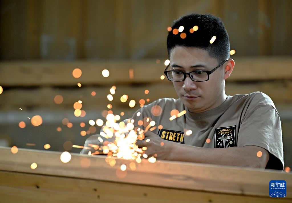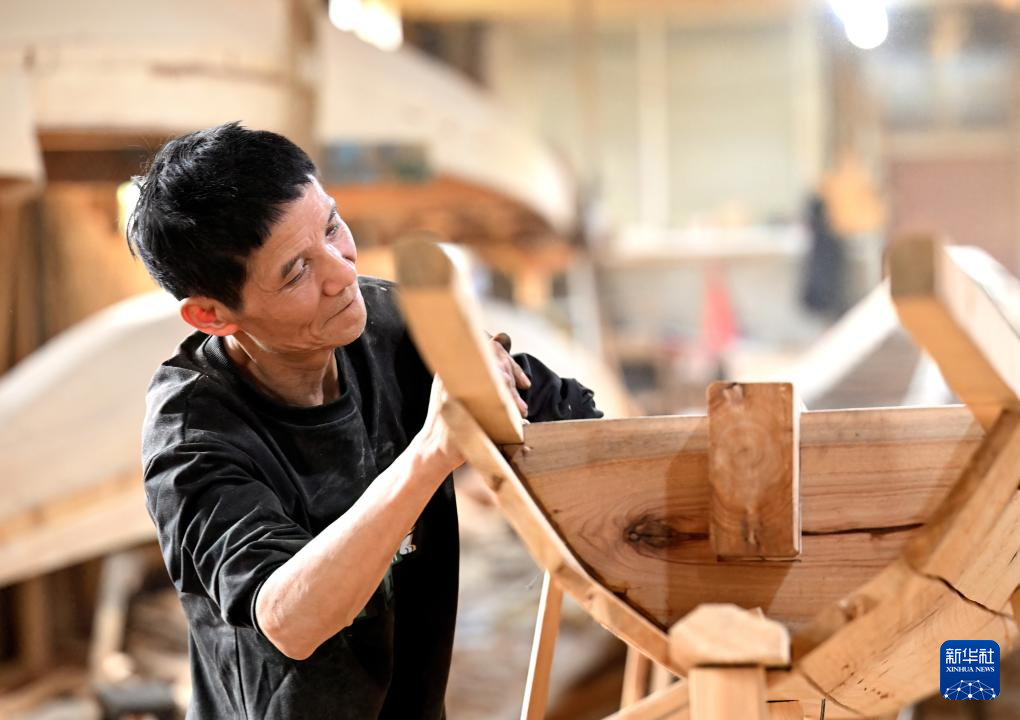 6月3日,“方莊龍舟制造技藝(閩侯縣)”第四代傳承人方劍偉在加工龍舟。新華社記者魏培全攝